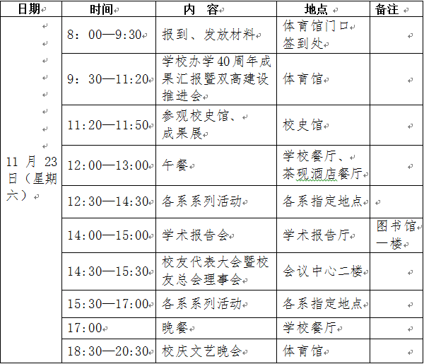 学校定于2019年11月23日(星期六)上午举行“学校办学40周年成果汇报暨双高建设推进会”。校庆期间,学校将围绕“砥砺奋进四十载,不忘初心续华章”的校庆主题,精心安排一系列校庆活动,展示我校40周年办学成就,进一步凝聚社会各界力量,共谋学校未来发展。我们诚挚地邀请海内外校友重回母校,也热忱地期盼社会各界朋友来校畅叙昔日情谊,共谋未来发展!