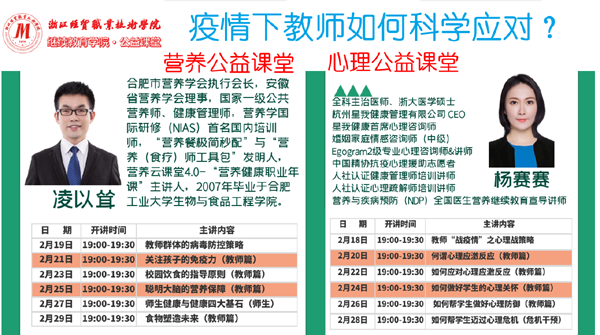 2月初,在何学军副校长的指导下,继续教育学院同舟共济,抗击疫情,第一时间拿出了抗疫应急方案。其中,《心理公益课堂&营养公益课堂》是一项基于抗“疫”背景下的系列直播公益行动,重点面向我校教职工,从2月18日至2月29日连续直播12天,每晚19:30-20:30开讲。心理公益课堂邀请中国精协抗疫心理援助志愿者、营养与疾病防治(NDP)全国医生营养继续教育宣导讲师杨赛赛做了《教师“战疫情”心理战策划(教师篇)》、《如何应对心理应激反应(教师篇)》、《如何做好学生的心理关怀(教师篇)》等六大主题的直播分享。营养公益课堂邀请合肥营养学会执行会长、国家一级公共营养师、营养学国际研修(NIAS)首名国内培训师凌以耸老师做了《教师群体的病毒防控策略》、《校园饮食的指导原则(教师篇)》、《师生健康与健康四大基石(师生)》等六大主题的精彩讲解。