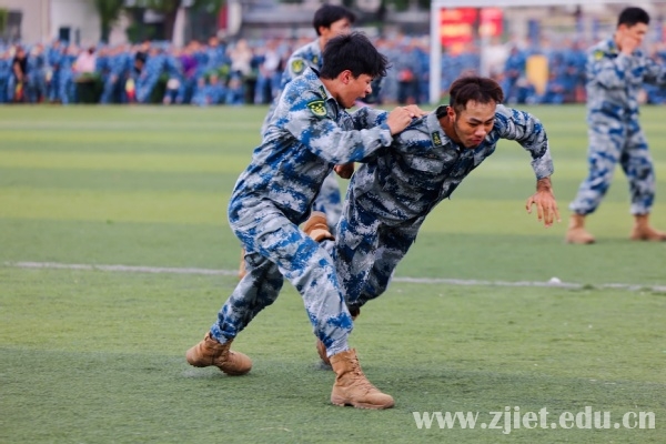 军事技能综合展示在激昂的音乐中震撼上演。团体操方阵依次摆出“我爱你中国”“不忘初心,牢记使命”“喜迎新中国成立75周年”“建校45周年”“厚德崇商”等字样,用青春告白祖国和学校。男子格斗术动如脱兔,身手敏捷,招式干脆利落;女子匕首操方阵英姿飒爽,动作利落,诠释女性力量与坚韧。军体拳方阵刚劲有力,虎虎生风,展现军人刚毅果敢。应急棍术方阵棍法娴熟,身姿矫健,展现强大战斗力。旗语方阵动作整齐,充满节奏感,传递青春活力。